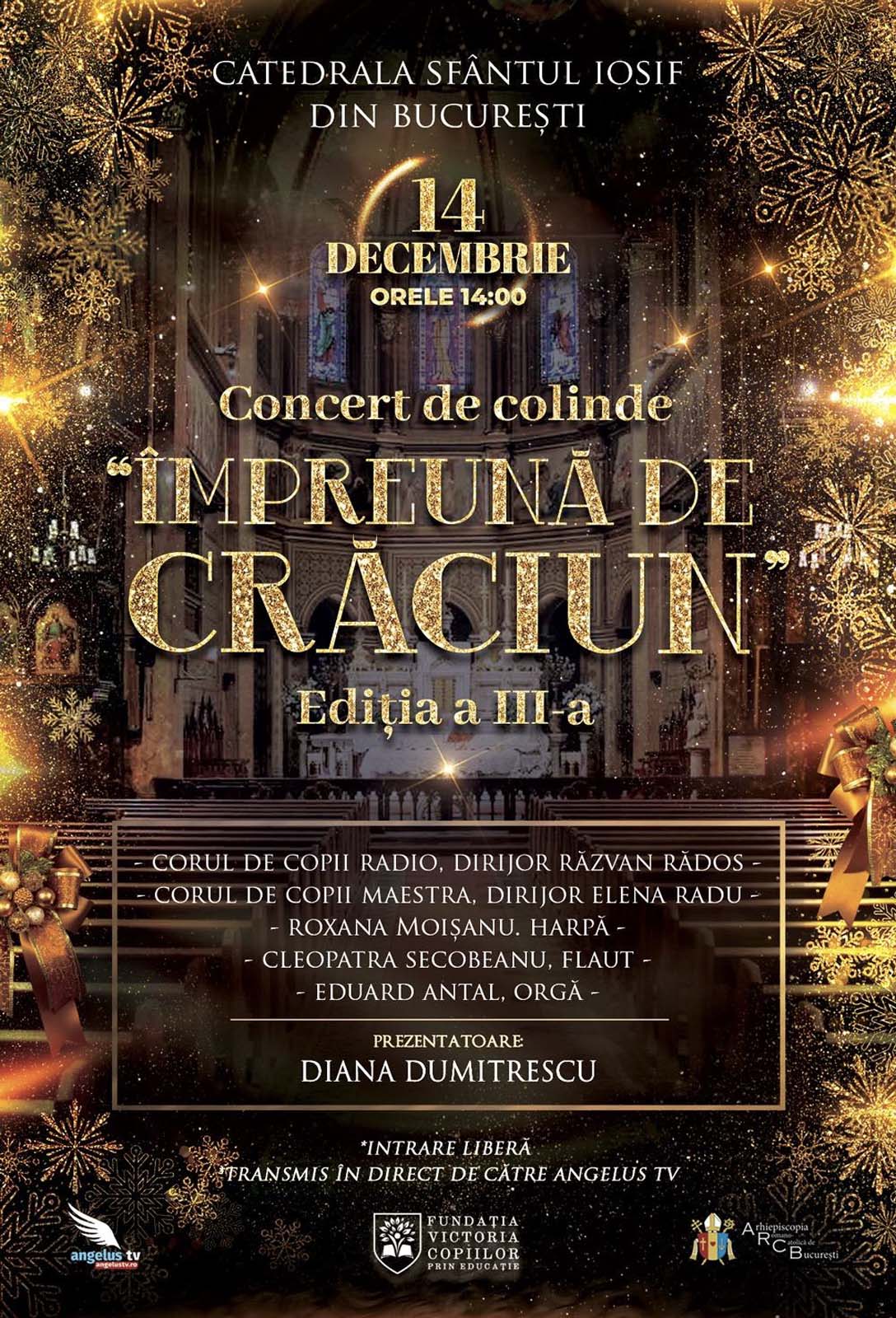 Fundația Victoria Copiilor prin Educație are plăcerea de a vă invita la concertul „Împreună de Crăciun”, care va avea loc sâmbătă, 14 decembrie 2024, începând cu ora 14:00, la Catedrala Sfântul Iosif din București. Evenimentul, ajuns la cea de-a treia ediție, promite să ofere o atmosferă de neuitat, îmbinând magia sărbătorilor cu muzica plină de emoție.